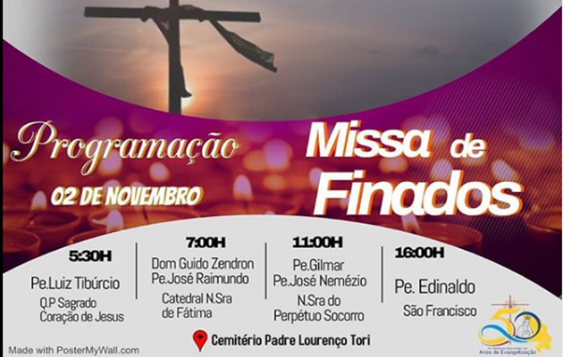Na próxima segunda-feira,2 de novembro, será celebrado em Paulo Afonso o Dia de Finados, quando os fiéis visitam nos cemitérios os túmulos de seus entes queridos e amigos falecidos, e, como os fiéis mantem o costume de ir ao cemitério participar da missa, neste ano, por conta da pandemia e evitar aglomerações serão celebradas 4 missas no cemitério Padre Lorenço Tori.