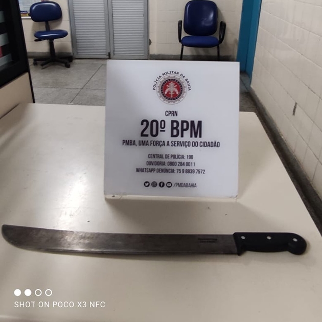 Em ato contínuo o CICOM informou a rota de fuga dos delinquentes, BA 210, sentido Glória/Paulo Afonso, e que estavam em duas motos Shineray e outro elemento em posse da bicicleta e que estariam armados com um facão. A guarnição diligenciou e teve êxito na captura do infrator, menor de idade, que estava na posse da bicicleta roubada, bem como encontrava-se armado com um facão.