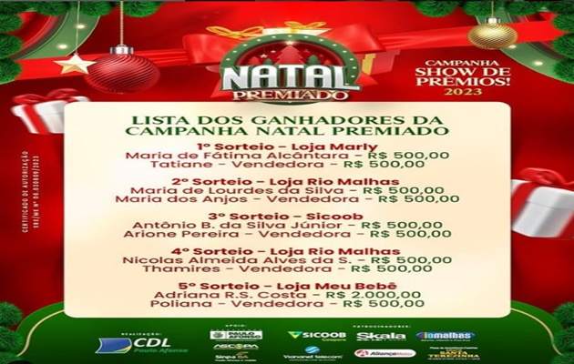 Na sexta-feira (15/12), foi realizado o primeiro sorteio da Campanha Natal Premiado 2023, quando foram sorteados quatro vale compras no valor de R$500,00 e R$2.000,00, para o cliente, e os vendedores dos bilhetes sorteados ganharam um vale compras no valor de R$ 500,00, para comprar nas lojas participantes da campanha.